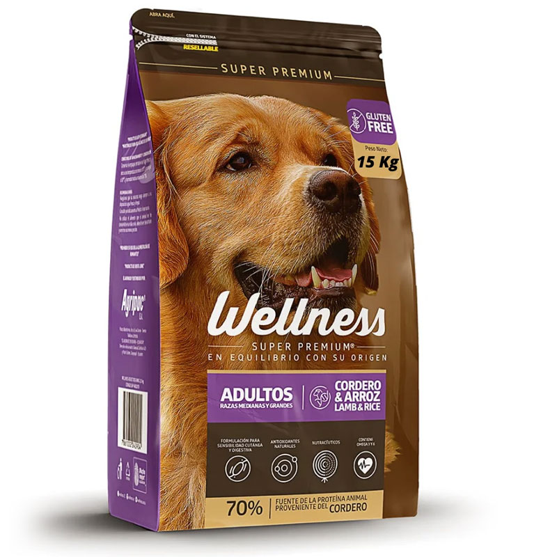 Cuida a tu perro de raza mediana o grande con la nutrición especializada de Wellness Adultos Cordero y Arroz. Este alimento Súper Premium está formulado para la sensibilidad digestiva y cutánea, con cordero como primera fuente de proteína y arroz de fácil digestión. Recíbelo en tu puerta con entrega a domicilio en Quito y el Valle de los Chillos.